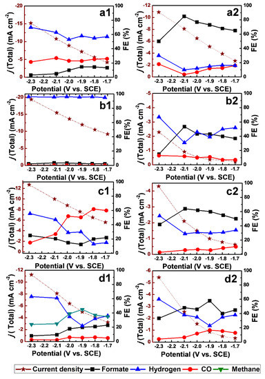 Electrochemical CO2 reduction on the surface of metal catalysts depends on many experimental factors such as crystal planes, surface modifications, particle size and morphology that lead to different reaction pathways resulting in different products [23]. Pd [24] and Au [25] have the high selectivity to CO, while Cu is identified to possess the high selectivity to hydrocarbons [26]. The catalytic activity of Pt [27] and Ni [28] for CO2 reduction is very low due to their optimum hydrogen adsorption energy for HER (hydrogen evolution reaction). The electrochemical CO2 reduction was performed with the prepared Pd (Pd/GC), Pt (Pt/GC), Au (Au/GC) and Cu (Cu/GC) electrode as shown in Figure 3a1–d1.