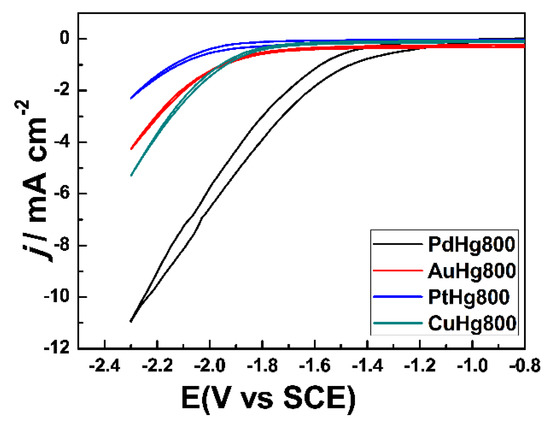 CV analysis was also conducted to examine the current density and the reduction behavior of CO2 with the metal amalgam electrodes as shown in Figure 4. PtHg800 shows the lowest current density in the CV analysis, while PdHg800 exhibits the highest current density. The onset potential of PdHg800 was much lower than that of PtHg800, AuHg800 and CuHg800. The current density from CV with the metal amalgam electrodes was well correlated with that from the electrochemical reduction reactions in Figure 3. The current density from CV with metal amalgam is listed in the order of PdHg800> CuHg > AuHg800 > PtHg800 at −2.3 V and of PdHg800 > AuHg800 > CuHg800 > PtHg800 at −1.7 V. The increase of the current density at the potential higher than −2.1 V can be attributed to H2 evolution due to limited solubility of the CO2. Solubility of CO2 in 0.1 M KHCO3 is 33 mM [9,31]. The CV patterns on metal amalgams are similar to that reported on Hg only [19], indicating that the reaction scheme on metal amalgam can be not much different from that on Hg. The intermediate of CO2 reduction is suggested to be CO2− [32]. On Hg, it was proposed that HCOO− was generated as follows [23];