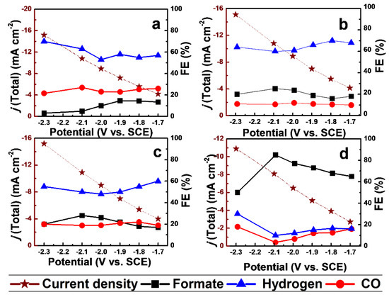 The standard potential of CO2− is −2.09–2.14 V vs. SCE in aqueous media [33]. In this aspect, the formate faradic efficiency on Hg only abruptly increased from zero at −1.6 V to 80% at −1.7 V and increased further up to 90% at −2.0 V [19]. The formate faradic efficiency of 90% was maintained at the potential range of −2.0~3.0 V. On the other hand, the formate faradic efficiency was maximized at −2.1 V on Pd, Pt and Au metal amalgam and at −1.9 V on Cu amalgam. The CO faradic efficiency with Hg only was negligible even at −2.0 V, while CO with metal amalgam was significant at −1.7 V showing metallic character. CO production has been proposed via HCOO− adsorption on metals such as Pd, Au, Ag and Cu [34].