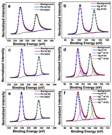 XPS analysis of prepared samples (a) PdHg100 Pd 3d, (b) PdHg100Hg 4f, (c) PdHg200 Pd 3d, (d) PdHg200 Hg 4f, (e) PdHg800 Pd 3d and (f) PdHg800 Hg 4f.