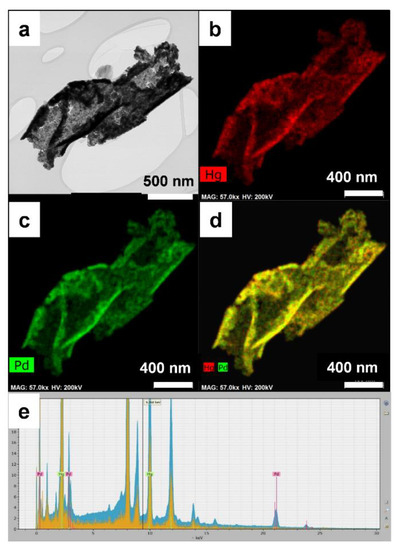 TEM and HAADF of peeled Pd2Hg5 amalgam from the surface of glassy carbon: (a) TEM, (b) HAADF Hg, (c) HAADF Pd, and (d) HAADF for Pd and Hg, and (e) ED analysis of prepared PdHg800.
