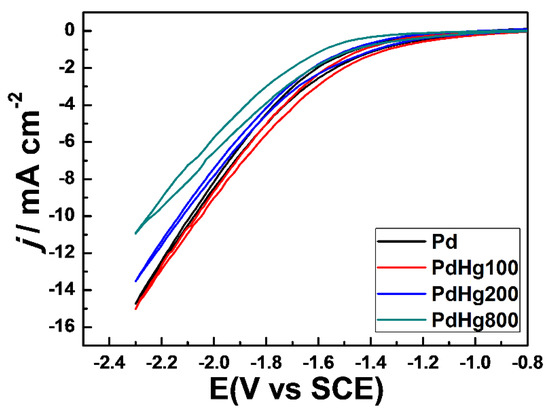 CV analysis in CO2 saturated 0.1 M KHCO3 solution at the scan rate of 50 mV·s−1 for PdHg800, PdHg200, PdHg100 and Pd.