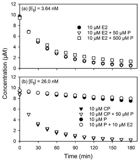 Residual concentrations of individual and mixed substrates over 3-h reaction periods: (a) effects of 50 and 500 μM phenol (P) on reactions of 10 μM estradiol (E2) with 3.64 nM laccase; (b) effect of 50 μM phenol (P) on the reaction of 10 μM cumylphenol (CP) and effect of 10 μM estradiol (E2) on the reaction of 10 μM phenol (P) with 26 nM laccase.