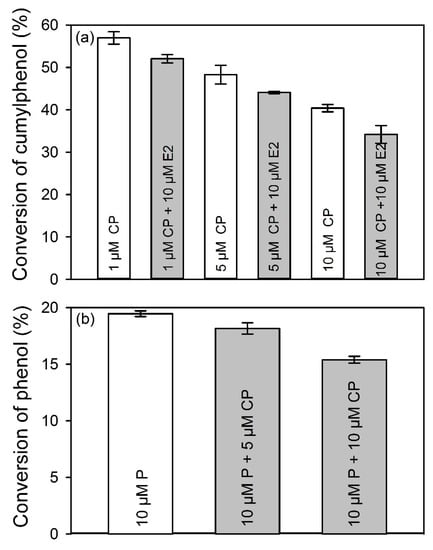 Effects of faster substrates on the conversion of slower substrates in multi-substrate experiments using 26 nM laccase after 3 h: (a) effect of 10 μM estradiol (fast rate, moderate inactivation) on the conversion of cumylphenol (intermediate rate, high inactivation) with initial concentrations of 1, 5, and 10 μM; (b) effects of 5 and 10 μM cumylphenol (intermediate rate, high inactivation) on the conversion of 10 μM phenol (slow rate, non-inactivating).
