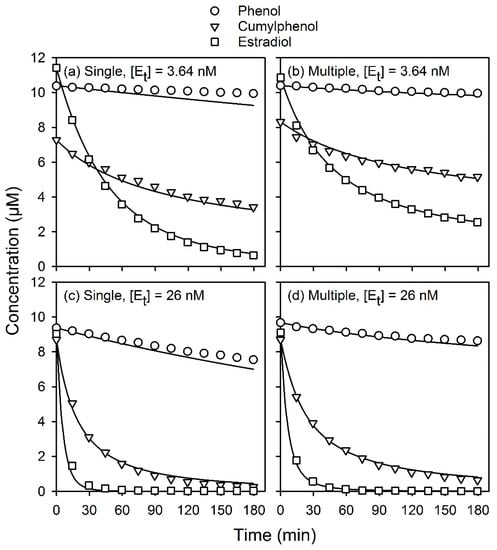 Single- and multi-substrate experiments were performed at laccase concentrations of 3.64 and 26 nM for phenol, cumylphenol, and estradiol at initial substrate concentrations in the vicinity of 10 µM. Measurements of substrate concentration over time are shown for single-substrate reactions in Figure 4a,c, and for multi-substrate reactions in Figure 4b,d. The corresponding model predictions are indicated by the solid lines, where the model equations were solved numerically using the initial conditions of substrate and laccase concentrations corresponding to each experiment.