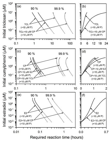 The first demonstration of the model’s utility is shown in Figure 7a,c,e. In these figures, the model has been used to estimate the reaction time required to achieve 90% and 99.9% conversion of a range of initial concentrations of triclosan (TCL), cumylphenol (CP), and estradiol (E2), respectively, in the presence of 10 µM secondary substrates while using an initial laccase concentration of 125 nM. This quantity of enzyme was selected because it was used in previous work when investigating the oxidation of single substrates [] and represents an intermediate concentration of enzyme equal to approximately 8.2 mg·L−1 based on a laccase molecular mass of 65 kDa. These concentrations are within the range of those used to calibrate the model’s kinetic parameters (see Table A1). For each of the targeted substrates, 90% and 99.9% conversion lines are plotted for the target substrate alone (e.g., TCL in Figure 7a), for the target substrate in the presence of a secondary substrate (e.g., TCL + 10 µM P; TCL + 10 µM CP), and for the target substrate in the presence of two secondary substrates (e.g., TCL + 10 µM CP + 10 µM P). Note that the dotted portions of the lines indicate when simulations were conducted outside of the range of substrate concentrations used to calibrate the model [], where they may be subject to greater error. Due to the findings reported in Section 2.2.2, the model was not used to simulate reactions when estradiol and triclosan were present simultaneously.