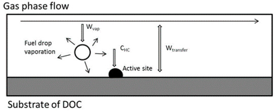 After the catalytic reaction, the hydrocarbon species are converted to carbon dioxide and water in the active sites. Then, products are released to the gas phase. The reaction is an exothermic reaction. Hence, the DOC substrate and exhaust are heated up by the exothermic process and reach the target temperature for DPF regeneration or some other utilization. The model of DOC thermal dynamics with post-injection was proposed by researchers [22]. Compared with previous models, the DOC thermal dynamics models using an HC doser have some differences. The diesel droplets, which are at room temperature, are injected into a hot exhaust. Hence, the heating up and thermolysis of the droplets need to be considered inside the DOC. The assumptions about the model are as follows: