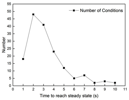The step response of uinj in the reaction model has approximate first-order characteristics. However, it costs less than 3 s to reach the peak value after dosing. As for the other conditions, the time to reach a steady state of oxygen consumption is most often less than 5 s. The statics of time are shown in Figure 4, according to hundreds of experimental groups. From the figure, about 88.2% of groups need less than 5 s to reach the steady state of oxygen consumption. Only light-load conditions, which have a lower mass flow rate, take more time to reach the steady state of oxygen consumption. As for the whole heating-up process of the DOC, most conditions need more than 60 s to reach the peak temperature in the outlet. The oxygen consumption rate is determined by the catalytic rate of C3H6, DF1, and DF2. The equation is shown in Equation (26).