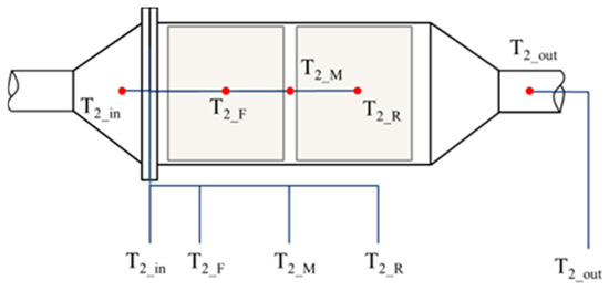 Five K-type thermocouples were mounted inside the DOC to record the thermal behaviors. One was on the inlet of the DOC, and the other was mounted on the outlet of the DOC. Three K-type thermocouples were inserted inside the DOC. The installation diagram of the five sensors is shown in Figure 7. The diameter of the thermocouples is 1 mm, which increases the sensitivity to temperature and allowed them to be easily inserted into the flow path of the substrate, with little damage to the DOC. In Figure 7 and Figure 8, T2_in, T2_F, T2_M, T2_R, and T2_out measure the exhaust temperature at each position. Among the sensors, T2_F and T2_R have some interference from the solid phase.