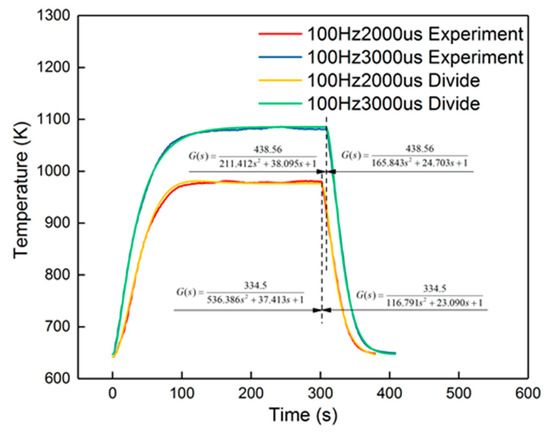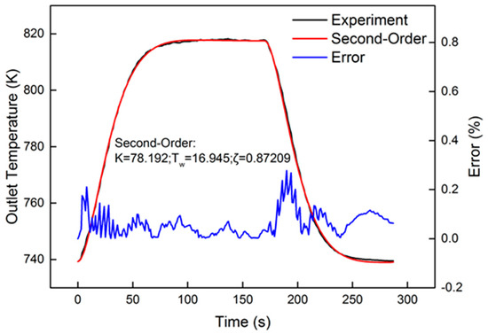 As a result, second-order identification with different dosing rates has high precision. The higher error that appears under a higher temperature condition can be eliminated using divided identification. After the division of the heating-up identification and cooling-down identification, the curves fit well with the second-order model.