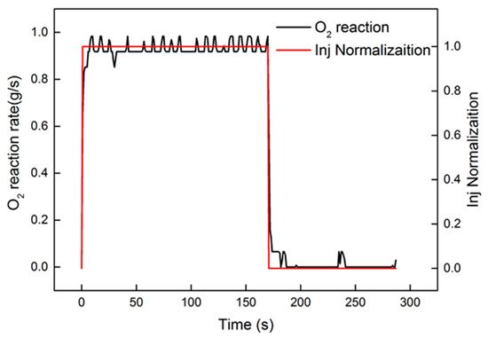where tp represents the necessary time for the oxygen rate to approximately reach steady state. From Equation (16), the energy release is shown. It consists of rs,C3H6, rs,DF1, and rs,DF2. Generally speaking, a quick approach to steadying the oxygen rate can correspondingly induce a quick approach to steadying the state of energy release (Φ). In other words, once the injection starts, the conversion of chemical energy to thermal energy inside tends to approximately steady the state very quickly. This conclusion is drawn from different simulations. Interested readers can simulate the model or refer to our Supplementary Materials. Because of the limitation of space, the simulation results are omitted here.