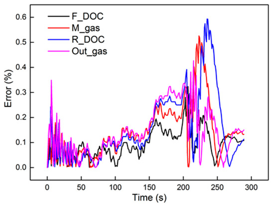 Figure 11 shows the identification results under the 2000 r/min 75% torque condition with the 40 Hz, 2000 μs dosing rate in the axial direction. The identified parameters are also presented in the figure. Compared to the front region, the rear region had a higher Tw and higher K. The reason can be explained by Equation (25). In Equation (25), Tw and K decrease with the increase in axial position. As for ζ, the equation is a non-monotone function, the trend of which is hard to investigate in the axial direction. The relative errors are shown in Figure 12. Obviously, M_gas and R_DOC had a peak error in the dynamic cooling-down process. The error was from β, which is not a constant in actual engineering. However, the peak error was less than 0.6%. It is shown that, although β is not a constant, it did not vary much; thus, it is entirely reasonable to consider it as a constant under steady-state conditions. Under these conditions, using a second-order linear model with two poles to identify the thermodynamics of the DOC temperature will induce a high-precision order reduction. From the results, it maintained a high precision of second-order characteristics in the axial direction.