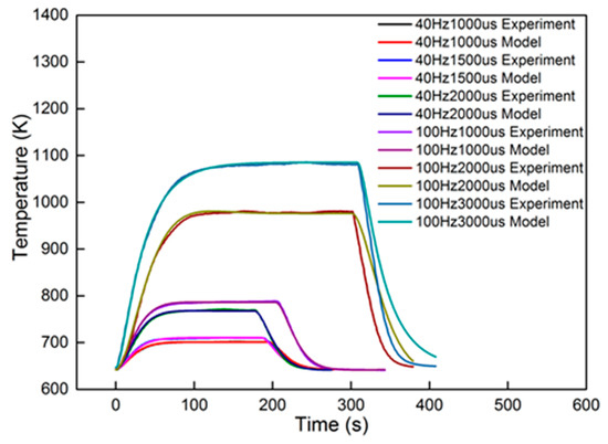 The peak error from the figure was 14%, which appeared in the cooling-down process. From the curves in Figure 14, it is also obvious that the corresponding curves were divided into two parts into 100 Hz, 2000 μs and 100 Hz, 3000 μs, when in the cooling-down process. From the experimental results, the reduced model had a slower decrement compared to the experimental curve. The explanation is that the parameters of the cooling process were different from the heating-up process, when the dosing rate was considerable. Hence, the cooling-down process should use other groups of second-order parameters. After identification, the new results are shown in Table 5. New curves are shown in Figure 16. The dynamic errors are shown in Figure 17. The peak error was reduced to 1.4% using the divided second-order parameters.