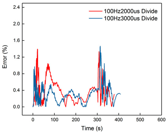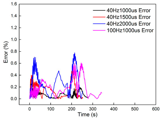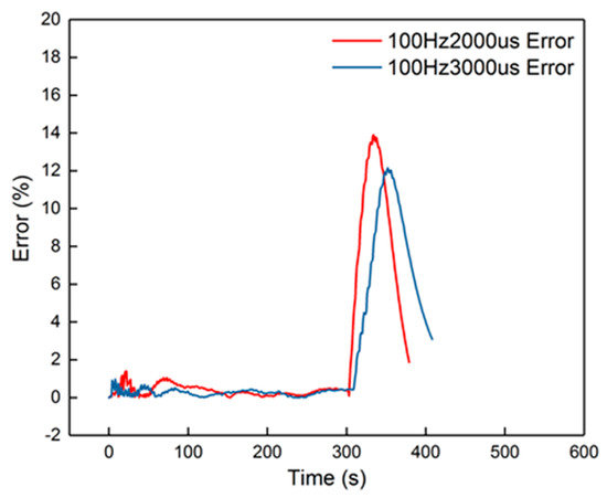 From the results, dosing from 40 Hz, 1000 μs to 100 Hz, 1000 μs had an accuracy higher than 94.5%. The dynamic errors of these four dosing rates are proposed in Figure 14. The peak value in the figure is less than 0.8%, proving that the second-order linear model can satisfy the dynamics of the heating-up and cooling-down processes, with different dosing rates. However, when the dosing parameters increased to 100 Hz, 2000 μs and 100 Hz, 3000 μs, the accuracy decreased to less than 85%. The dynamic errors are shown in Figure 15.