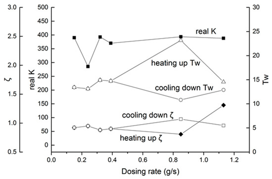 From Figure 18, for most parameters in the K range, from 370 to 390, only the 40 Hz, 1500 μs group had a large deviation. As for Tw and ζ, the parameters had a little change from 0.15 g/s to 0.39 g/s. When the dosing rate was higher than 0.4 g/s, deviations in Tw and ζ appeared. As a conclusion, the increment of the dosing rate induces some irregularity, which needs online identification or more intensive calibration to determine the actual parameters.