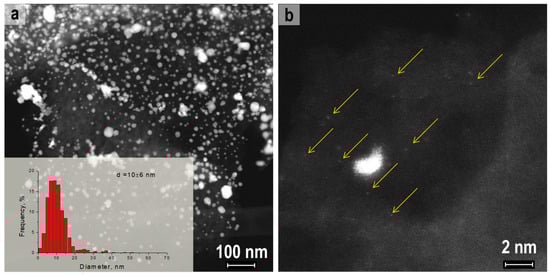 To determine the particle size distributions, the samples were studied using a conventional transmission electron microscope Zeiss LEO 912 OMEGA (Freiburg, Germany) at acceleration voltage of 120 kV and a FEI Titan 60–300 (Eindhoven, The Netherlands) microscope at acceleration voltage of 300 kV in HAADF/STEM mode. At least 100 metal particles have been measured for particle size distribution analysis.