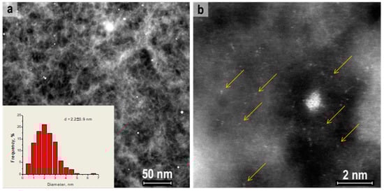 Using a higher magnification, single Au atoms and few-atoms clusters are seen in HAADF/STEM images of the Au/C catalyst (Figure 1b) and of the Au/N-C catalyst (Figure 2b). For the latter sample, the contribution of these Au species could be even higher due to a higher overall dispersion of Au. It is important that the single atoms are not stabilized by chlorine as no chlorine was found in the samples by XPS [41]. Hence, gold in the both carbon supported catalysts is presented as single metal atoms and nanoparticles. These particles are of about 2 nm sizes for the N-doped carbon, SiO2 and Al2O3, and about 10 nm for the N-free sample (Table 1, Figure 1, Figure 2 and Figure 3). Thus, N-doping of the carbon support led to a significant improvement of the Au dispersion.