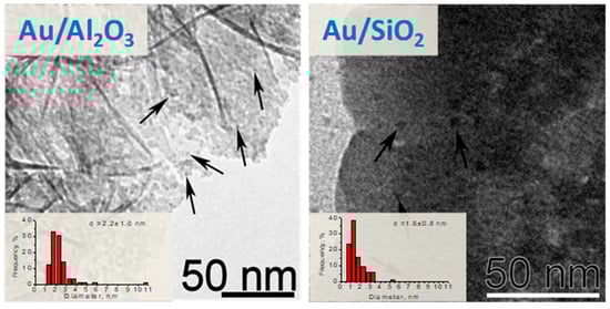 TEM images and particle size distributions for the Au/Al2O3 and Au/SiO2 catalysts after the reaction. Some Au particles are indicated by arrows.