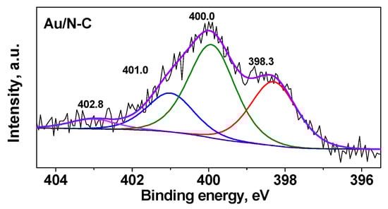 Synchrotron radiation based N 1s XPS spectrum of the Au/N-C sample is presented in Figure 4. The spectrum was fitted by four components corresponding to pyridinic N (398.3 eV, 30 at%), pyrrolic N (400.0 eV, 49 at%), graphitic N (401.0 eV, 15 at%), and pyridine-N-oxide (402.8 eV, 6 at%) states. The total surface content of nitrogen in the sample was 4.6 at%. No nitrogen was found in the Au/C sample.
