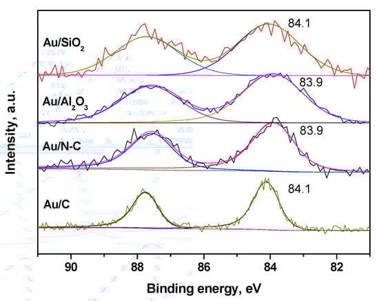 The Au catalysts after the reaction were studied by a laboratory XPS to understand the electronic state of Au. These studies showed the presence of Au only in metallic state (Au 4f7/2~84.0 eV) (Figure 5). The position of the Au 4f7/2 peaks for all the catalysts was the same within experimental error (±0.1 eV). Much narrower Au 4f7/2 lines for the Au/C catalyst as compared to other catalysts should be assigned to a much bigger size of the metallic Au nanoparticles in this sample (Table 1) in accordance with the data in the literature [42]. The presence of chlorine atoms was not found in the samples.