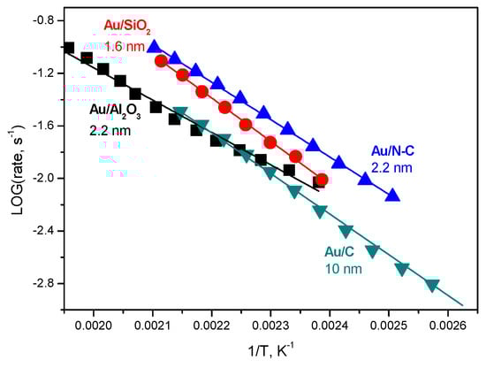 The apparent activation energies (Ea) for the studied Au catalysts are in the range from 48 up to 63 kJ mol−1 (Table 1). These values correspond well to the literature values for different supported Au catalysts [18,19,21,24]. Earlier, we showed that the alumina supported Au catalysts were more active than the Au catalysts supported on amphoteric and basic supports like ZrO2, CeO2, La2O3, and MgO oxides [19]. However, the present study indicated that the activity of the Au/Al2O3 catalyst was lower than that of the Au catalysts supported on the N-C and SiO2 supports despite the lowest apparent activation energy for this catalyst (48 kJ mol−1, Table 1). These data probably show that a smaller ratio of the surface Au atoms is active in this sample than in the other samples. These could be low coordinated Au or Au-support interface sites the concentration of which could depend on the particle size and particle shape determined by the support nature.
