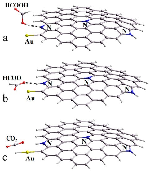Optimization of the geometry of the formic acid molecule and the catalyst fragment (Au at N-graphene fragment, Figure 8a) also found a local energy minimum corresponding to adsorption of the molecule at the pyridinic nitrogen atom located near the Au atom on the edge of the fragment. In the optimized position, the N···H(O) distance was equal to 1.76 Å. In this case the protonation of the pyridinic N atom takes place as well as for the N-doped fragment without the Au atom (Figure 7). The binding energy of the molecule with this fragment was stronger than that with the fragment without Au and equal to 0.88 eV. This value was also higher than the value in the case when the formic acid molecule was adsorbed through the oxygen atom of the OH group directly on the Au atom in a similar configuration (0.72 eV) [41].