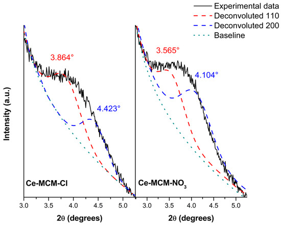The 110 and 200 reflections were found in 3.86 and 4.42° for Ce-MCM-Cl and in 3.56 and 4.10° for Ce-MCM-NO3, respectively. The values obtained for d100 and a using the information of the 200 deconvoluted reflections are compiled in Table 1. For Si-MCM-41, the d100 value calculated from the 200 reflection (3.88 nm) was close to the one observed experimentally (3.84 nm), validating our data obtained from Equations (1) and (2). As can be observed in Table 1, the values of a calculated for the cerium materials confirmed the unit cell expansion mentioned before and this effect was more expressive towards Ce-MCM-NO3.