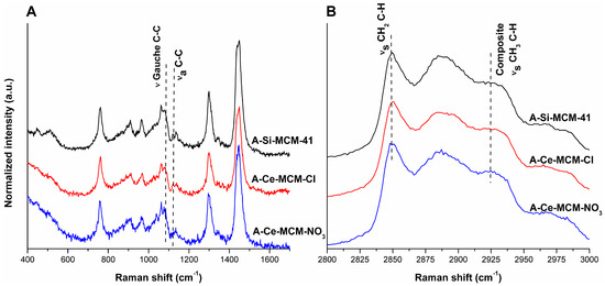 To investigate the origin of non-framework CeO2 species, as well as the consequences of using different cerium precursors, Raman spectroscopy was performed in both as-synthesized and calcined MCM-41 materials. The Raman spectra of as-synthesized materials can give information on how an assembly of surfactants is affected by other ionic species in the synthetic medium. Raman signals of organic molecules are dominant in this situation and the occluded CTA+ cations can be in the same arrangement from the synthetic medium, counter-balancing the negative charges from deprotonated silanol groups. Also, the use of CTA+ as a probe to access information towards microstructural characteristics from the framework of as-synthesized MCM-41 has been little explored in the literature [51,56,57], encouraging the use of conformational-sensible spectroscopic techniques, such as Raman spectroscopy, in the unraveling of microstructural changes.