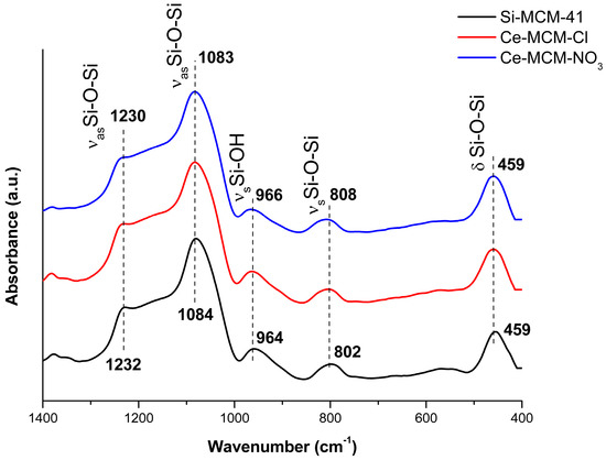 The vibrational modes between 1400 and 400 cm−1 are typical of Si-O-Si bonds [78]. In the case of Si-MCM-41: (i) Asymmetric stretching of Si-O-Si bonds at 1232 and 1084 cm−1; (ii) symmetric stretching of Si-OH bonds at 964 cm−1; (iii) symmetric stretching of Si-O-Si at 802 cm−1; and (iv) the Si-O-Si bending mode at 459 cm−1. Changes in the wavenumber of these modes are frequently associated to isomorphic substitution of heteroelements in the framework of silica-based materials, because the average length of T-O bonds (T corresponds to any heteroatom) in the walls of the MCM-41 is increased with the insertion of a larger atom than silicon [37,49,51]. However, the shifts observed for the cerium-incorporated materials were too small to make any assumption of isomorphic substitution. In addition, no vibrational modes attributed to Ce-O bonds, between 1600 and 900 cm−1 and below 700 cm−1, were evidenced. These observations (i.e., small shifts and absence of Ce-O bonds) could be respectively attributed to the low concentration of framework Ce4+ ions and non-framework CeO2 when compared to the amount of silica in MCM-41.