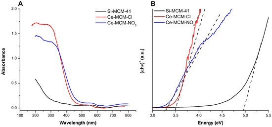 Diffuse reflectance UV-Vis (DRS UV-Vis) spectra for the calcined materials are displayed in Figure 6A. When compared to Si-MCM-41, cerium-incorporated materials presented stronger absorption in the ultraviolet range and a red shift of the absorption edge due to O2−→Ce4+ charge transfer [32]. These experimental observations are proof of cerium incorporation in the materials, as already described by Pal and co-workers [32]. Moreover, the greater intensity of the Ce-MCM-Cl spectrum can be due to its slightly higher cerium content (see Table 1).