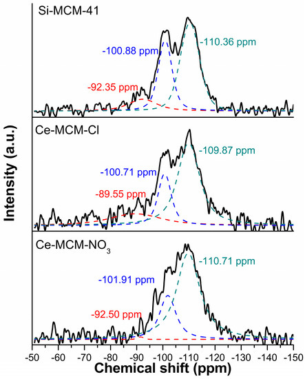 29Si MAS-NMR spectra of the calcined materials are available in Figure 7. As can be seen, the signals obtained for all samples were broad and overlapped in the range between −80 and −120 ppm. This interval is typical for the Qn-groups with a general formula of Si(OSi)n(OH)4−n [82]: (i) Geminal silanols or Q2 groups (resonating around −90 ppm); (ii) terminal silanols or Q3 groups (resonating around −100 ppm); and (iii) siloxane or Q4 groups (resonating around −110 ppm). The overlapping effect is typical in systems based on amorphous silica due to the wide distribution of Si-O-Si bond angles and Si-O bond lengths [82]. It was possible to perceive that, in the case of Ce-MCM-Cl, there was a slight diminishment in the signal of Q3 groups, indicating a decrease in its content. This type of change was even more noticeable for Ce-MCM-NO3, where all defect-related environments (Q2 and Q3) were significantly reduced when compared to Si-MCM-41. Such qualitative observations indicate that the cerium incorporation is modifying the condensation of Si-O-Si bonds in the structure of these materials. To access more information towards the latter, deconvolution methods were applied and are denoted in Figure 7.