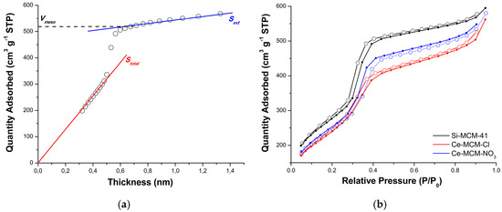 Thickness or t-plot curve for Si-MCM-41 (a) where the blue line slope corresponds to Stotal, the red line slope corresponds to Sext, and the dashed black line intercept with the y-axis corresponds to Vmeso; N2 adsorption/desorption isotherm for Si-MCM-41, Ce-MCM-Cl, and Ce-MCM-NO3 (b) where filled circles correspond to adsorption and hollow circles corresponds to desorption.