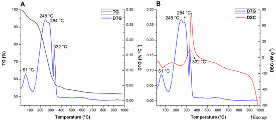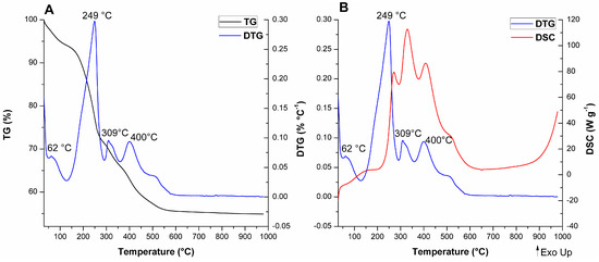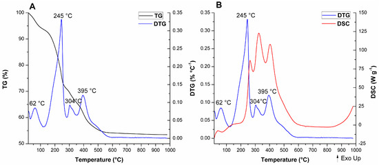 Thermal analysis obtained under synthetic air for A-Ce-MCM-Cl: TG and DTG curves (A); DTG and DSC curves (B). The temperatures indicated refers to DTG maximums of observable peaks.