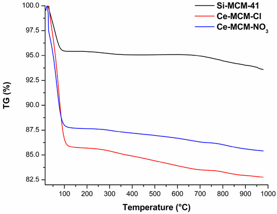 The TG curves of the calcined MCM-41 materials (Figure 14) and the mass loss associated to all processes (Table S3) are displayed in the Supplementary Material. These curves provided significant information to differentiate the materials among themselves, where a difference in total mass loss from room temperature to 1000 °C was observed in all solids. The two thermal events were associated to the evaporation of adsorbed water (endothermic event from room temperature to temperatures around 115 to 150 °C) and the condensation of silanol groups (water evaporation until 1000 °C). The major mass loss was associated to the initial evaporation of water: 4.58%, 14.23%, and 12.29% for Si-MCM-41, Ce-MCM-Cl, and Ce-MCM-NO3, respectively. Also, this event ends in higher temperatures for the cerium-modified samples than for Si-MCM-41 (usually above 130 °C). Altogether, these observations indicate that cerium incorporation increases the surface polarity of the materials, somewhat expected since cerium is less electronegative than silicon. Also, the mass loss from silanol condensation was different for the three materials: 1.70%, 3.50%, and 2.67% for Si-MCM-41, Ce-MCM-Cl, and Ce-MCM-NO3, respectively. Thus, it is noticeable that the isomorphic substitution leads to less thermally stable materials, highlighting the fact that Ce-MCM-Cl is less stable than Ce-MCM-NO3, evidence of its higher degree of silicon substitution in the framework. This is expected once the insertion of heteroelements causes bond angle tension and loss of the crystalline mesophase as indicated by XRD data, which is in accordance with the disordering effect proposed for the crystallization of the materials and corroborated previously with other characterization techniques.