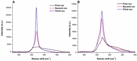 Raman spectra of the as-synthesized materials between 400 and 1700 cm−1 (A) and 2800 and 3000 cm−1 (B). The signals used for the determination of the disorder parameters are indicated.