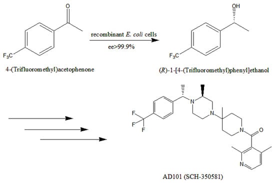 - Wang, N.Q.; Li, J.; Sun, J.; Huang, J.; Wang, P. Bioreduction of 3,5-bis(trifluoromethyl)acetophenone using ionic liquid as a co-solvent catalyzed by recombinant Escherichia coli cells. Biochem. Eng. J. 2015, 101, 119–125. [Google Scholar] [CrossRef]