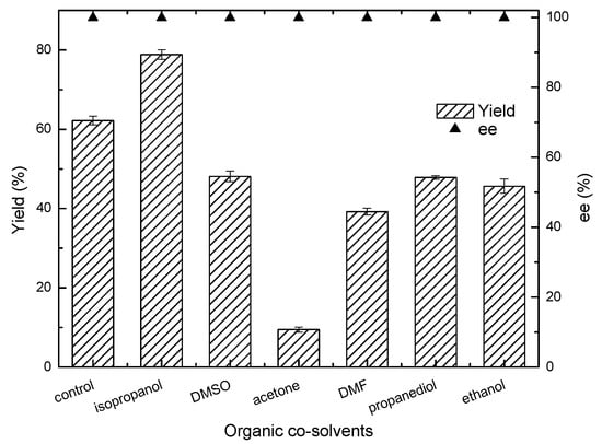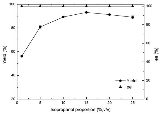Figure 4 depicts the influence of the isopropanol proportion in buffer solution on the yield and ee of the product. In the range of the isopropanol concentration from 1% to 25% (v/v) in the reaction buffer, the highest yield of 93.1% was achieved at a volume fraction of 15% isopropanol. A further increase in the isopropanol content resulted in the slight decline of product yield. It is likely that the excessive amount of isopropanol possibly causes higher conformational mobility, thus increasing the tendency of enzyme denaturation []. The ee value of the product remained above 99.9% with the addition of isopropanol. Thus, isopropanol at a volume fraction of 15% showed the best effect on the yield.