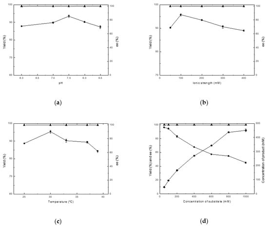 Effects of pH. (a) Ionic strength; (b) temperature (c) and substrate concentration (d) on the asymmetric reduction of 4-(trifluoromethyl)acetophenone. Symbols: (●) Yield, (▲) ee and (◆) product concentration.