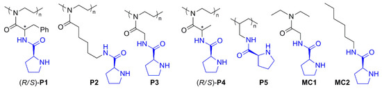 Structures of poly(2-oxazoline)-bound L-prolinamide catalysts (P1−P4), prolinamido-poly(allylamine) (P5), and small-molecular analogs (MC1, MC2).