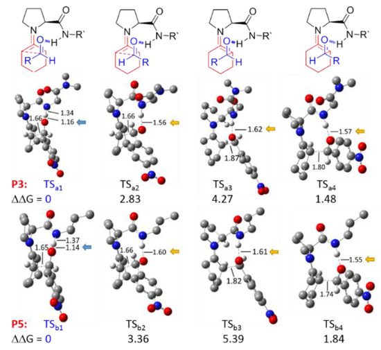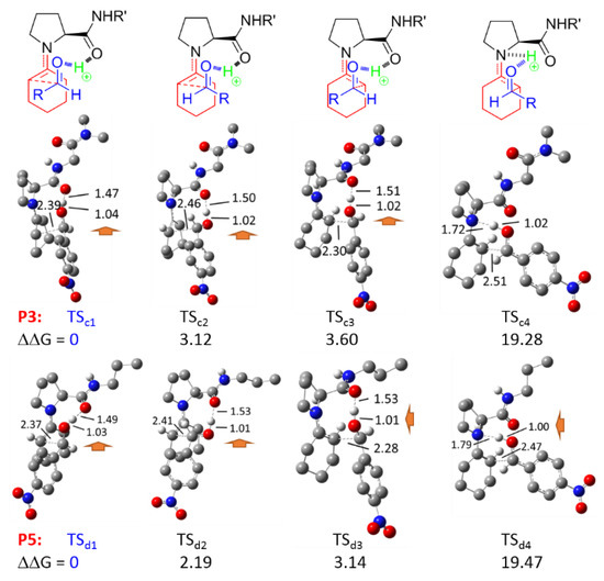 Optimized enamine/aldehyde reaction transition states in the P3-/P5-catalyzed aldol addition of cyclohexanone to 4-nitrobenzaldehyde in the absence of acidic additives. Relative energy barriers (in kcal/mol) and relevant geometric parameters are shown (in Å). Partial hydrogen atoms are hidden for clarity.