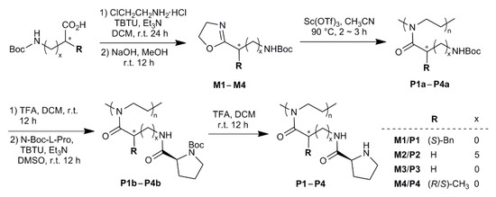 As depicted in Scheme 1, the employed protocol involves the synthesis of 2-oxazoline monomers, ring-opening polymerization, and post-modification of corresponding polymers. Monomers M1−M3 were prepared readily from Boc-protected amino acids and 2-chloroethylamine via two-step reactions with a total yield of 65–80%, according to a generally adapted method [23,24]. (R/S)-M4 were synthesized using a different method, described in the Supplementary Information (Scheme S1; Figures S1−S6).