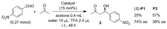 Contrastingly, the structural change introduced by the substituents at the alkyl spacer has a considerably large degree of influence on the stereochemical outcome. For example, higher enantioselectivity (87–91% ee) but with lower yield (42−45%) were noticed for P1 in comparison to P4 (71–79% ee, 91−94% yield; entries 1−2 vs. 5−6, Table 1). Similarly, for the reaction of acetone (a smaller aldol donor than cyclohexanone) with 4-nitrobenzaldehyde P1 also gave a much higher ee value (74%) and lower yield (25%) than P3 (38% ee, 57% yield), as shown in Scheme 2 (also see: Figures S20–S21). These findings indicated that the benzyl group in the side chain may provide P1 with a rigid environment that preferred the stereocontrol in enamine/aldehyde reaction transition by steric hindrance, which could also be one of the factors responsible for the observed lower conversion because the bulky substituent prevents the access of substrates.