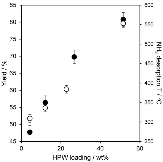 Successful immobilization of HPW over SBA-15 has been previously demonstrated by a range of bulk and surface characterization techniques, including N2 porosimetry, elemental analysis, X-ray powder diffraction (XRD), X-ray photoelectron spectroscopy (XPS), high-resolution transmission electron microscopy (HRTEM) and ammonia and propylamine chemisorption [16]. The heteropolyacid content in the resulting family of HPW/SBA-15 materials can be readily varied between 4.3 and 51.6 wt % (3.2–38.2 wt % W, Table 1). Low loadings resulted in isolated Keggin clusters (Figure S1), which aggregated at loadings >9 wt % HPW to form crystalline secondary structures around 10 nm diameter. This coincided with a small decrease in the Brunauer Emmer-Teller (BET) surface area and a more significant fall in the pore volume (Figure S2) likely due to the blockage of micropores within the silica walls. HRTEM confirmed that Keggin units were uniformly dispersed throughout the ordered mesopore channels (Figure S3), and thermogravimetric analysis that these were thermally stable up to 380 °C [16], for all loadings. The resulting HPW/SBA-15 materials exhibited high acid densities.