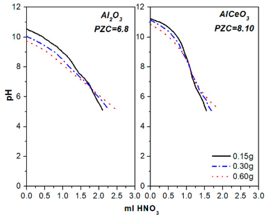 Also, for both catalysts, the pore volume remained almost unchanged following calcination, but dropped substantially after reduction. However, the doping of Al2O3 with CeO2 resulted in enhanced basicity, as shown from the potentiometric titration curves obtained for the Al2O3 and AlCeO3 suspensions, with the PZC values recorded at 6.8 and 8.2, respectively (Figure 1). It is noted that the PZC is defined as the pH value where the basic and acidic sites on the surface are in equilibrium [40].