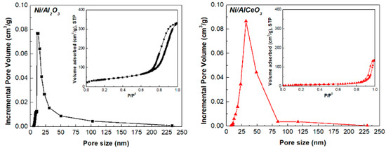 Pore size distribution and N2 adsorption-desorption isotherms (inset) of the reduced Ni/Al2O3 and Ni/AlCeO3 catalysts.