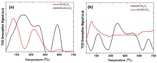 Figure 4a presents the CO2–TPD profiles obtained over the Ni/Al2O3 and Ni/AlCeO3 catalysts. The Ni/Al2O3 catalyst presents mainly two types of basic sites of weak and medium strength. This is reflected by the peaks that appeared in the temperature regimes of 30 °C < Tmax < 220 °C and 220 °C < Tmax < 450 °C. The strong basic site population is very limited. On the other hand, it seems that the modification of Al2O3 support with Ce leads to a catalyst with a limited population of weak basic sites and a wider distribution of medium strength basic sites, whereas the population of strong basic sites is enhanced significantly. This result is in good agreement with the PZC studies, discussed earlier.