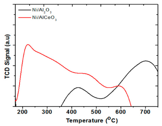 Metal-support interactions (electronic or geometrical) are crucial in defining the catalytic properties. In general, NiO interaction with the support, as well as the size of NiO, regulates the extent of its reduction. Weak interaction with the support is considered to give rise to reduction peaks at low temperatures, whereas peaks at high temperatures are due to a strong NiO-support interaction. In the H2-TPR profile of the Ni/Al2O3 catalyst (Figure 5), two predominant peaks at 420 °C and 690 °C are apparent (Figure 5). The peak at 690 °C is due to the reduction of nickel aluminate (NiAl2O4), while the peak at 420 °C is due to small NiO crystallites interacting with the support (supported NiO). The small hump at 390 °C for the Ni/Al2O3 catalyst can be assigned to the reduction of bulk NiO [52]. The addition of Ce causes a redistribution of species and most likely changes the support size thus affecting the NiO-support contact area, with the latter being increased. This causes a reduction profile with peaks at lower temperatures compared with the Ni/Al2O3 catalyst.