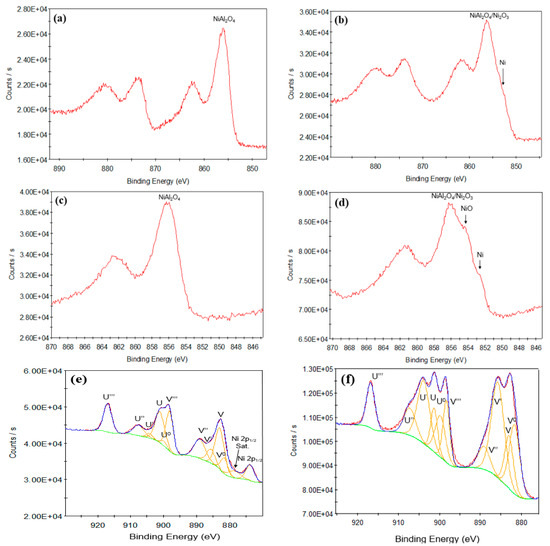 The XPS Ni 2p and Ce 3d peaks for both the calcined and reduced Ni/Al2O3 and Ni/AlCeO3 catalysts are shown in Figure 6a–f. The Ni 2p3/2 peak for the calcined Ni/Al2O3 sample shows a peak at a binding energy of 856.1 eV, associated with the presence of NiAl2O4 (Figure 6a). The reduced catalyst also shows the presence of a main Ni 2p3/2 peak at a binding energy of 856.1 eV due to NiAl2O4/Ni2O3 but also a shoulder at lower binding energies at around 853 eV, due to the presence of metallic Ni (Figure 6b). For the Ni/AlCeO3 catalysts, only the Ni 2p3/2 peak and satellite is shown in the Figure 6c,d as the 2p1/2 peak and satellite overlap with the Ce 3d peaks.