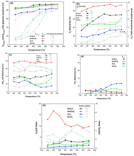 Finally, the influence of reaction temperature on the H2/CO and the CO/CO2 molar ratios in the gaseous products’ mixture is presented in Figure 7e. For the Ni/AlCeO3 catalyst, the CO/CO2 molar ratio is close to zero for the whole temperature range, while the H2/CO molar ratio value decreases with increasing temperature from a value of about 17 (450 °C) to a value of about 10 (550–750 °C). In contrast, for the Ni/Al2O3 catalyst, both ratios are equal to 2–3 and appear relatively stable over the whole temperature range under investigation. The H2/CO molar ratio value is more or less negligible for the supporting materials, whereas the CO/CO2 molar ratio values range from about 2 between 400 and 500 °C, increases from 500 to 600 °C and decreases again for 650 °C < T < 750 °C (its maximum value was ~5.5 for the Al and ~4 for the AlCeO3 sample). It is known that in the reaction process, dehydrogenation of the adsorbed glycerol molecule first takes place on the metal surface of catalyst to give adsorbed intermediates for the cleavage of C–C or C–O bonds.