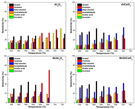 In accordance with previous research (e.g., [10,12,31]), a variety of liquid products were identified for the GSR however, only the main ones, i.e., acetone, acrolein, acetaldehyde, acetic acid, allyl alcohol, and acetol were quantified. The influence of temperature on liquid product selectivity for the Ni/Al2O3 and Ni/AlCeO3 catalysts and the corresponding supports is shown in Figure 8. For the Ni/AlCeO3 catalyst and the AlCeO3 support, production of liquid effluents ceases over 700 °C, 50 °C higher compared to the Ni/Al2O3 sample. In contrast, pure alumina produces liquid effluents even at temperatures as high as 750 °C. Another important observation is the differences in the liquid product distribution between modified and unmodified samples. Specifically, for the Ni/AlCeO3 and AlCeO3, allyl alcohol seems to be the main product (at least for high temperatures), with acetaldehyde and acetone the secondary products. On the other hand, acetone is the main product at the high temperature range for the Ni/Al2O3 sample and acetic acid and acetol for pure alumina.